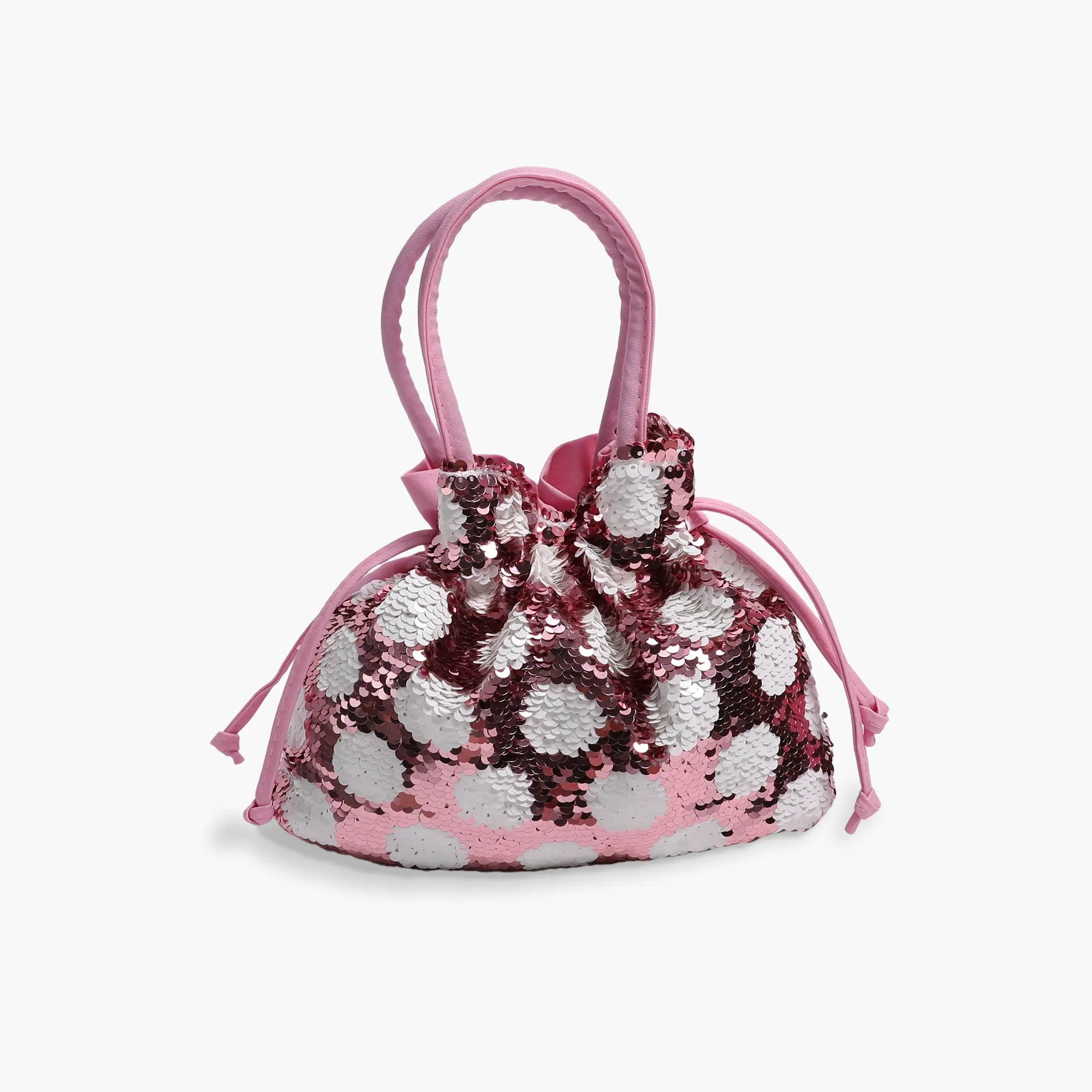 Pink and white sequin hand bag, magnetic clasp, drawstring. Dimensions - height 19cm, depth 8cm. 100% polyester.