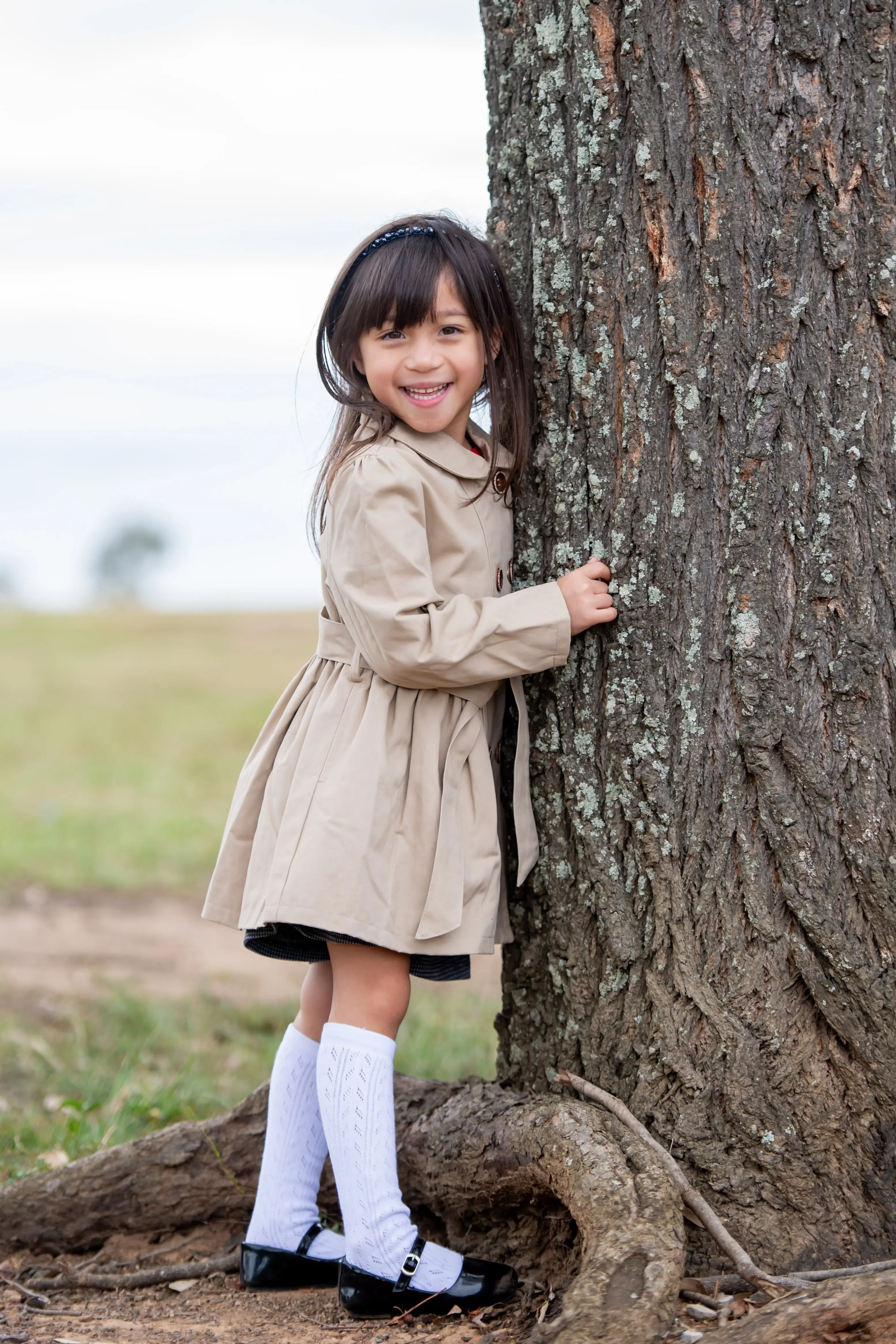 A chic wardrobe essential, our Junior Girls Beige Trench Coat is an elegant addition designed to elevate any winter outfit. Lightweight and versatile, this quality jacket has a double breasted design with tortoise shell buttons and a self fabric waist tie to perfect the fit.