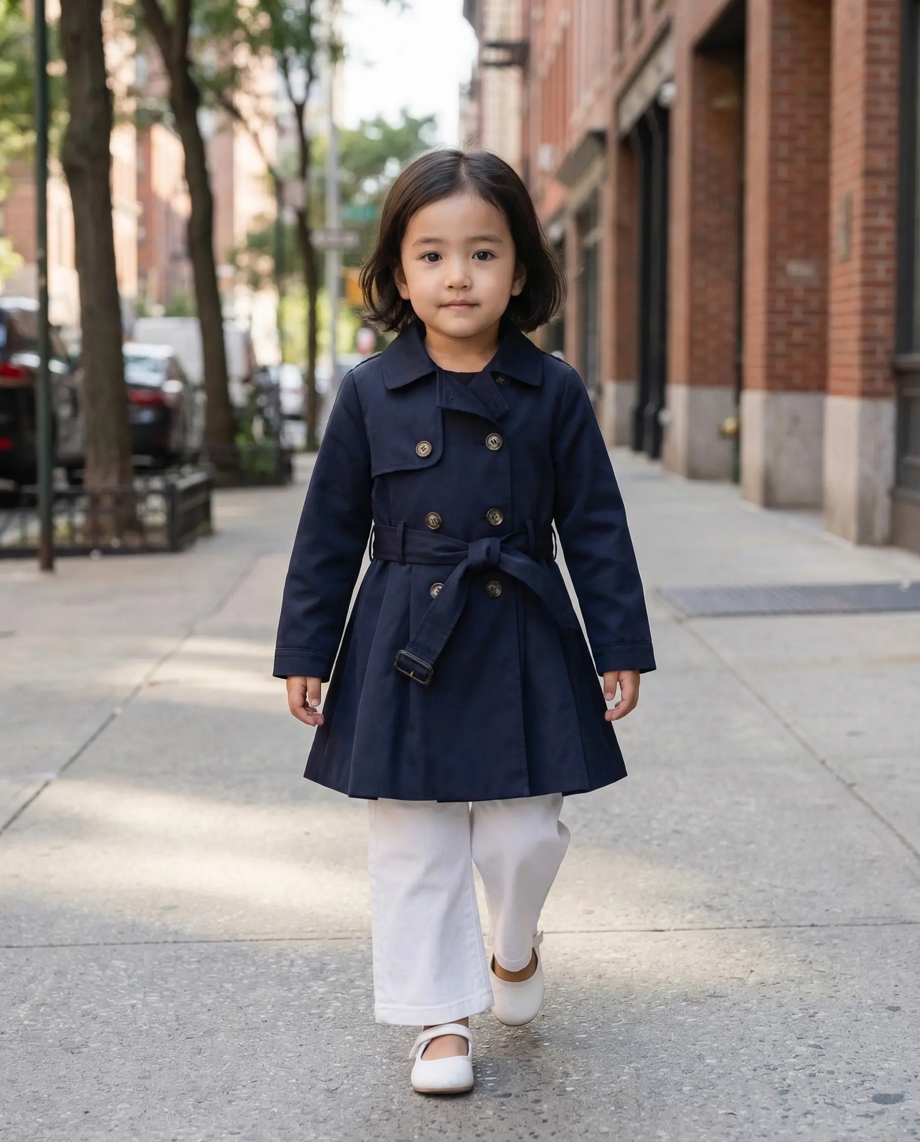 A winter style must have, our Junior Girls Navy Blue Trench Coat will elevate her weekend outfits with its sophisticated style. This coat is crafted with a lightweight material, sports a double breasted design and tortoise shell buttons with a same fabric waist tie for the perfect and versatile fit.
