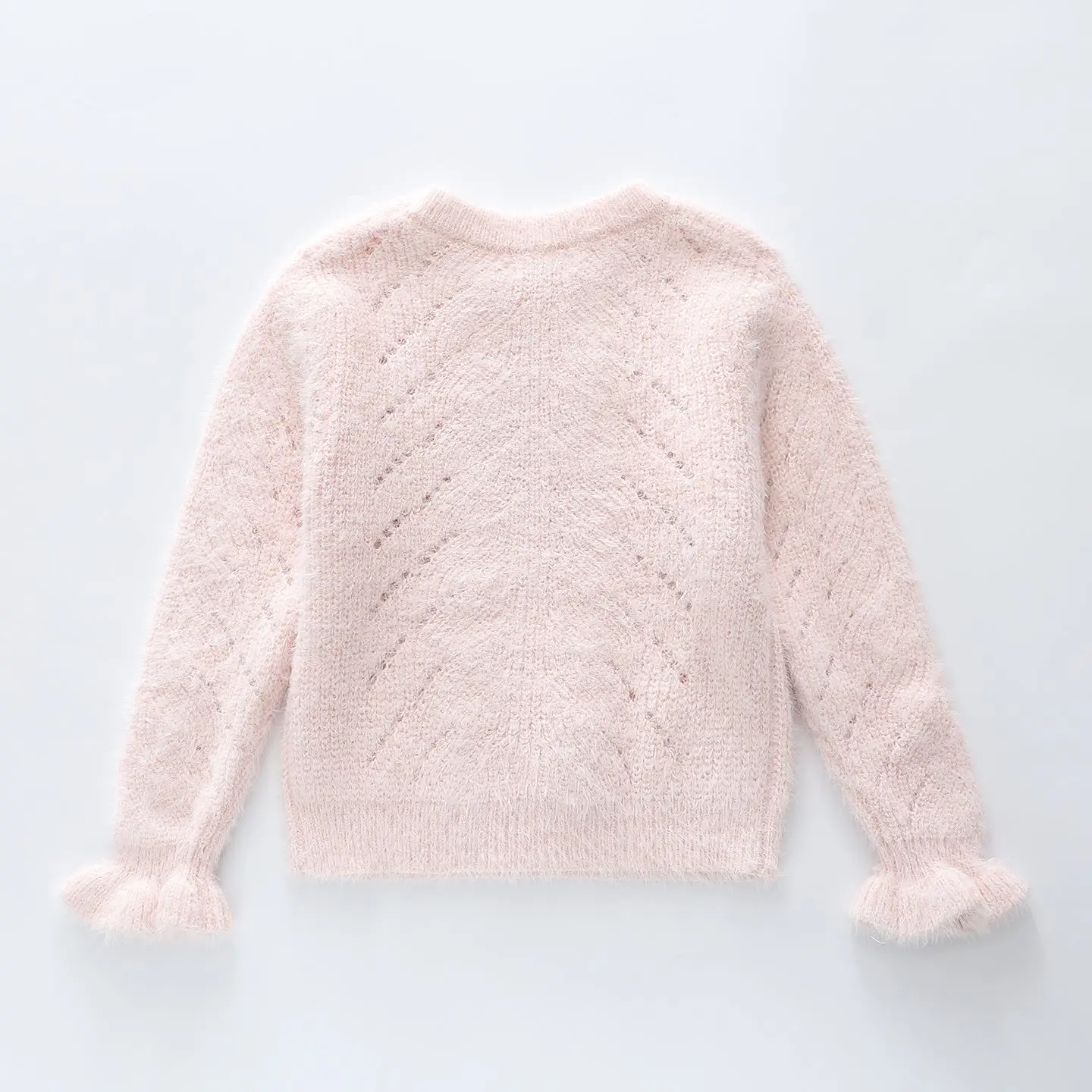 Beautifully designed, our girls Soft Pink Sparkle Jumper is a luxuriously soft and cosy sweater. Crafted with a fluffy textured yarn, this sweater is adorned with a subtle lurex shimmer detail. Perfect for special events and weekend outings, this gorgeous pullover is finished with delightful ruffle cuffs.
